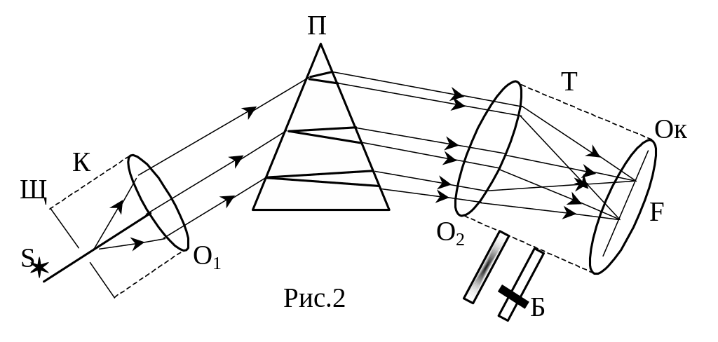 коліматора, який являє собою трубу з об’єктивом О1 на одному кінці і щілиною Щ на іншому. Щілина міститься у фокусі об’єктива О1, тому промені досліджуваного світла, якими освітлена щілина Щ, вийшовши з коліматора, падають на призму П паралельним пучком;