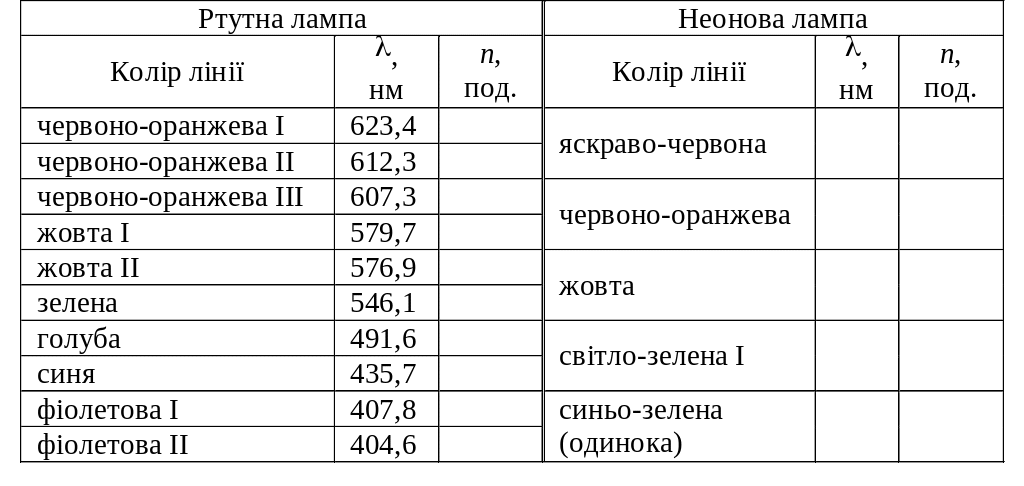 - •IV. Хід роботи Завдання 1. Визначення сталої дифракційної гратки