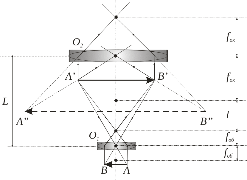 Предмет розташовується між фокусом та подвійним фокусом об’єктива. А окуляр розташовується на такій віддалі від об’єктива, щоб зображення, яке дає об’єктив, знаходилось між фокусом окуляра і самим окуляром.