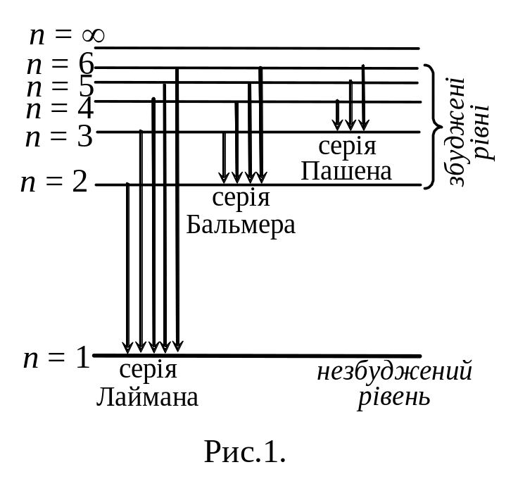 Серії Бальмера, Лаймана і Пашена схематично зображені на рис.1.