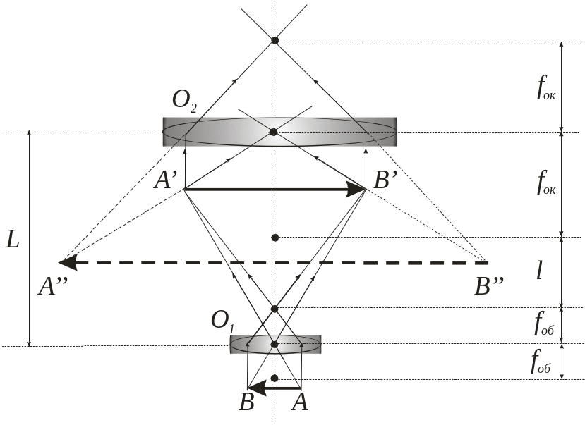 Предмет АВ розташовується на віддалі від об’єктива, дещо більшій fоб. Дійсне збільшене і перевернуте зображення А/В/ знаходиться на віддалі від окуляра, дещо меншій fок, воно розглядається в окуляр, як в лупу. В результаті одержується уявне, збільшене і перевернуте (відносно предмета) зображення А//В//, що знаходиться на віддалі L від окуляра, що називається віддаллю найкращого зору (для нормального ока L ~25 см). Віддаль l між внутрішніми фокусами об’єктива і окуляра називається оптичною довжиною тубуса мікроскопа (звичайного l ~ 16 см). На рис.1 сильно перебільшені віддалі від предмета АВ до фокуса об’єктива і від зображення А/В/ до фокуса окуляра. Крім того, не дотримані співвідношення відстаней L, l, f об і fок. В дійсності fоб і fок значно менше L і l (з цих причин зображення А//В// предмета виявилось розташованим між об’єктивом і окуляром, хоча звичайно воно розташовується з одного боку з предметом АВ від об’єктива). Враховуючи це, одержимо наближені вирази збільшень об’єктива Yоб і окуляра Yок: