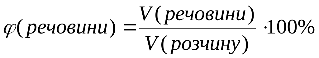 Об’ємна частка розчиненої речовини – дорівнює відношенню об’єму речовини до об’єму розчину і виражається числом, меншим за одиницю, або у відсотках: