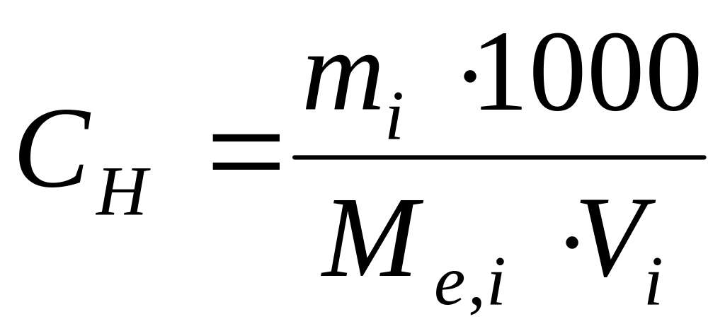 де mi – маса розчиненої речовини, г; Мe,i – молярна маса еквівалента речовини, г/моль екв; Vi - об’єму розчину, мл; 1000 – коефіцієнт переходу від мілілітрів до літрів.