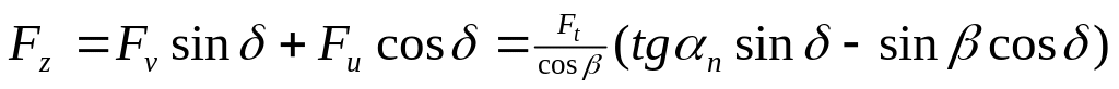 2-й розрахунковий випадок: нормальна до лінії зубця сила має проекцію на твірну початкового конуса спрямованого до його вершини. В зв’язку з цим у формулах (4.42) і (4.43) знаки в дужках змінюються на протилежні. Спрямування осьової сили до вершини конуса небажане в зв’язку з можливістю заклинювання передачі при значних осьових зазорах в підшипниках. Нескладно уявити, що при ∑ = δ1 + δ2 = 900 радіальна сила на шестерні по величині дорівнюватиме осьовій силі на колесі, а осьова сила на шестерні, відповідно радіальній силі на колесі.