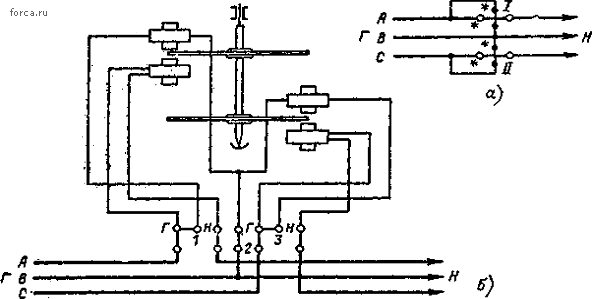 Рис. 2, Принципиальная схема измерения мощности по схеме двух ваттметров (а) и схема трехфазного двухэлементного счетчика (б)