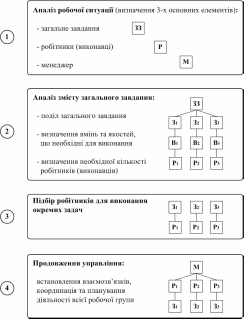 аналіз змісту загального завдання: розподіл загального завдання на більш дрібні задачі; визначення якостей та навичок, необхідних для їх виконання; визначення необхідної кількості робітників-виконавців;