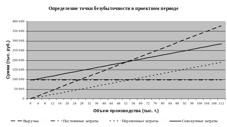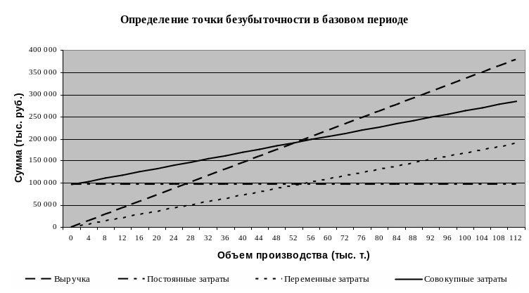Анализ уровня нулевой прибыли (или точки безубыточности) является одним из методов учета, который позволяет определить уровень деятельности, при котором не будет ни прибыли, ни убытков, ни излишков, ни дефицита. С помощью этого метода можно определить такой уровень деятельности организации, при котором стоимость входных ресурсов равна доходу от реализации выходной продукции. Этот уровень обычно называется уровнем нулевой прибыли. В базовом и проектном периодах расчет точки безубыточной работы осуществляется по следующим формулам: