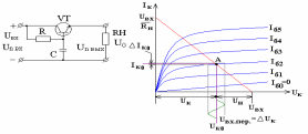 Если провести на графике нагрузочную прямую (UК = UВХ при IКО = 0 и IК = UВХ / RН при UК = 0 ) и выбрать на ней рабочую точку А (UК0, IКО}, то сопротивление транзистора переменой составляющей тока в точке.