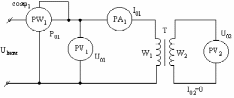 Измеряемыми параметрами являются номинальное напряжение вторичной цепи (U02) и первичной цепи (U01) (их называют напряжением холостого хода), ток первичной цепи (I01 - ток холостого хода), активная мощность или потери в магнитопроводе (P01). Если устанавливаем измеритель коэффициента мощности, то активная мощность рассчитывается из соотношения:
