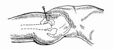 Обезбольте кожу и продвигайте иглу кзади по направлению к средней оси конечности, предваряя введение новокаина продвижению иглы вперед до проникновения в сустав.
