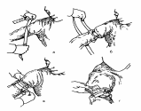 А – растягивание жгута; б – наложение растянутого жгута, в – закрепление конца жгута; г – закрепление записки