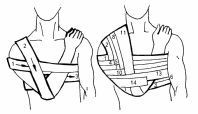 После этого бинт ведут наискось к подмышечной области здоровой стороны, оттуда по спине наискось на надплечье поврежденной стороны и далее вертикально вниз по передней поверхности грудной клетки параллельно плечу и под локтевой сустав.