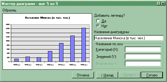 В окно Название диаграммы введите «Население Минска (в тыс. чел. )».