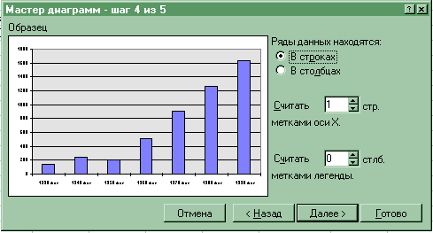 Например, в нашем образце диаграммы Мастер диаграмм правильно определил, что данные представлены в виде строк, и менять ничего не надо.