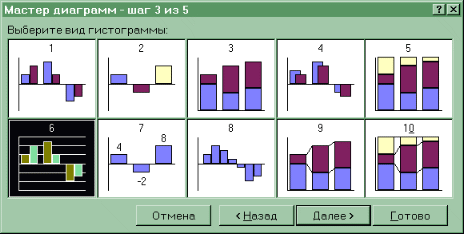 Содержимое третьего диалогового окна зависит от того, какой тип диаграммы вы выбрали. Так как на предыдущем шаге была выбрана гистограмма, то окно выглядит так, как показано на рис.2.3.