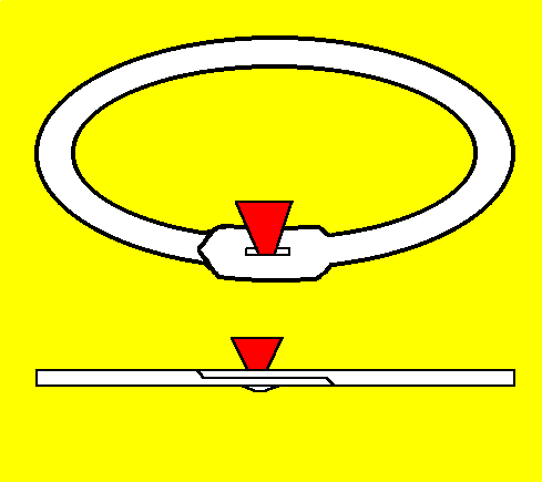 | Теперь возьми клепальные клещи и аккуратно положи кольцо с заклепкой на глубокое отверстие. Нажми на клещи. Это загонит заклепку в отверстие. А здесь это показано под двумя различными углами. |
