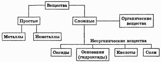 Приведенная схема до некоторой степени отражает и возможности протекания химических реакций — как правило, в химическое взаимодействие вступают соединения, принадлежащие к разным половинам схемы. Так, основные оксиды реагируют с кислотными оксидами, кислотами и кислыми солями; кислоты реагируют с металлами, основными оксидами, основаниями, основными и средними солями. Естественно, что такая схема не дает исчерпывающей информации обо всех возможных реакциях, однако она отражает основные типы реакций.