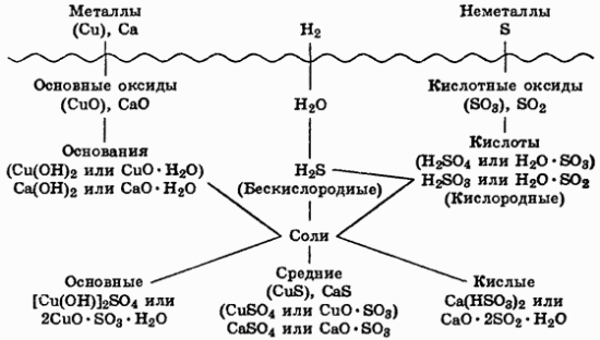 В левой части схемы под металлами помещены их типичные соединения — основные оксиды и основания, в правой части схемы помещены соединения, типичные для неметаллов, — кислотные оксиды и кислоты. Водород, помещенный в верхней части схемы, дает очень специфический, идеально амфотерный оксид — воду H2O, которая в комбинации с основным оксидом дает основание, а с кислотным — кислоту. Водород в сочетании с неметаллами образует бескислородные кислоты. В нижней части схемы помещены соли, которые, с одной стороны, отвечают соединению металла с неметаллом, а с другой — комбинации основного оксида с кислотным.