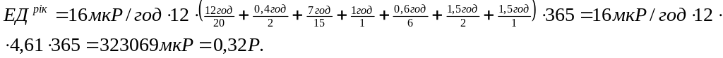 Розраховуємо експозиційну дозу випромінювання на яку досліджувана людина наражається протягом року, враховуючи її щоденний режим життя: