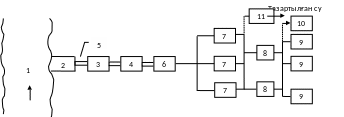 4-Тазарту құрылғысы; 5-Кәсіпорынға баратын су құбырының желісі; 6-Екінші көтергіштегі сорғылық станциясы 7-Реттеуші сыйымдылық; 8,9,10,11 – суды тұтынушылар; 12-Үрлеу;13- Тазарту құрылғысы; 14- Тазартылған судың резервуары;