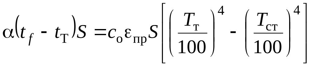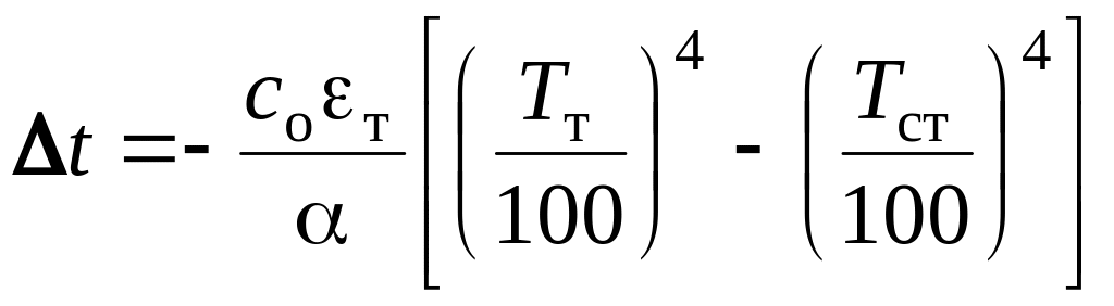 Власна температура tт чутливого елемента (рис. _____) встановлюється в результаті теплової взаємодії з газом і оточуючими стінками. Якщо допустити, що перенос теплоти теплопровідністю в чутливому елементі і захисному чохлі відсутній, то при встановленому тепловому режимі кількість теплоти, яку отримує чутливий елемент від газу шляхом конвективного теплообміну дорівнює кількості теплоти, яку віддає поверхня чутливого елемента шляхом випромінювання на оточуючі стінки: