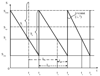 В табл. 1. приведены основные параметры используемые при описании стратегий управления запасами. На рис. 1. дана иллюстрация данных параметров в виде графика поступления и расходования запаса при детерминированных параметрах спроса (λ=const) при одинаковых партиях поставок (Sп=const): заказ производится в момент τз, когда текущий запас ST равен критическому уровню (точка заказа) Sз, а поставка производится в момент tп при этом текущий запас ST мгновенно увеличивается на величину Sп до максимального Smax..