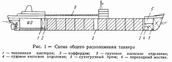 Корпус судна делится по длине на три части: носовую, включающую форпик, топливную цистерну – диптанк, судовое насосное отделение и на некоторых танкерах старой постройки – сухогрузный трюм; центральную – с грузовыми танками и грузовым насосным отделением, и кормовую, куда входят ахтерпик, машинно-котельное отделение и топливные цистерны, располагаемые обычно по бортам МО. Центральная грузовая часть отделяется от концевых коффердамами. В пределах этой схемы варьируются лишь отдельные элементы: наличие или протяженность сухогрузного трюма и носового диптанка и положение насосного отделения. Кроме того, на судне может быть средняя рубка или, как это довольно часто встречается в последнее время, все жилые и служебные помещения, включая посты управления, сосредоточивают в корме (рис. 1).