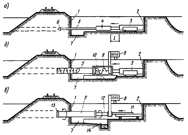 Рис.1. Закрытые способы разработки грунта а - прокладывание; б - продавливание; в - горизонтальное бурение; l - ход штока; 1 - крепление передней стенки рабочего котлована; 2 - упор, устанавливаемый на задней стенке рабочего котлована; 3 - гидравлический домкрат; 4 - шомпол; 5 - труба; 6 - конический наконечник; 7 - приямок для наращивания трубы; 8 - привод; 9 - шнековое устройство для извлечения грунта из трубы; 10 - рама, передающая давление; 11 - реечный домкрат; 12 - вращающийся шпиндель; 13 - режущая коронка; 14 - лоток и приямок для пульпы