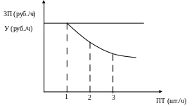 Из рисунка видно, что при повременной оплате труда размер заработной платы (ЗП) не зависит от производительности труда (ПТ), но удельная заработная плата в расчете на каждую единицу продукции (У) при росте производительности труда будет уменьшаться. Из этого следует весьма важный вывод: в условиях применения повременной оплаты труда при низкой производительности труда предприятие имеет риск роста затрат.