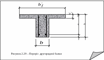 Оскільки другорядна балка, як і плита , є частиною монолітного перекриття, то переріз другорядної балки має таврову форму. Розрахунковий переріз балки – тавр з полицею угорі. Коли розтягнення відбувається внизу, то полиця знаходиться у стиснутій зоні. ЇЇ треба враховувати на ширині не більше, ніж