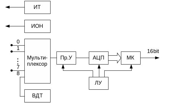 Данный преобразователь имеет на входе 8-ми канальный мультиплексор, позволяющий подключать различные источники сигнала. 9-й канал предназначен для подключения встроенного датчика температуры. ИТ и ИОН используются для подачи соответствующих токов и напряжений, необходимых для работы датчиков.
