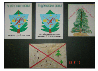 - А кроме прав у граждан есть и обязанности. Одна из обязанностей – сохранять природу и окружающую среду. Выполнять ее нужно для того, чтобы наша страна была красивой, а люди в ней – здоровыми. Мы рисовали листовки «В защиту хвойных растений» (Показывает стенд с листовками и фотовернисаж «Сохраним эту красоту». Фото 3,4. )