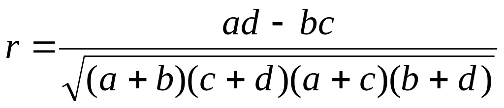 За якою формулою можна визначити коефіцієнт кореляції між двома спряженими експериментальними показниками у випадку їхньої альтернативної мінливості? (……)