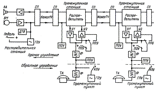 При передаче от промежуточных пунктов необходимо выключить У1 и включить У2, что достигается посылкой сигнала прямого управления нажатием кнопки прямого управления (КПУ) и подключением к линии генератора прямого управления (ГПУ) с частотой, например, 2500 Гц. Ток от ГПУ поступает в приемник прямого управления, который выключает У1 и включает У2. При необходимости перебоя со стороны распорядительной станции посылается сигнал обратного управления от генератора обратного управления (например, той же частоты 2500 Гц). Ток обратного управления проходит на промежуточных станциях в приемники обратного управления, которые нарушают цепь работы У2 и включают У1. Режекторные фильтры (Ф) препятствуют прохождению сигнала прямого и обратного управления в телефонные аппараты.