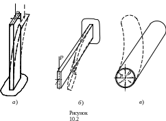 Так при сжатии достаточно длинных и тонких стержней вместо укорочения в соответствии с законом Гука они могут изогнуться (рис. 10.2,а). При прямом изгибе балок направление прогиба балки может существенно отклониться от линии действия нагрузки (рис. 10.2,б), и, наконец, при действии внутреннего давления на цилиндрическую оболочку ее деформации в некоторый момент перестают быть осесимметричными, оболочка искривляется и принимает некоторую новую форму (рис. 10.2,в).