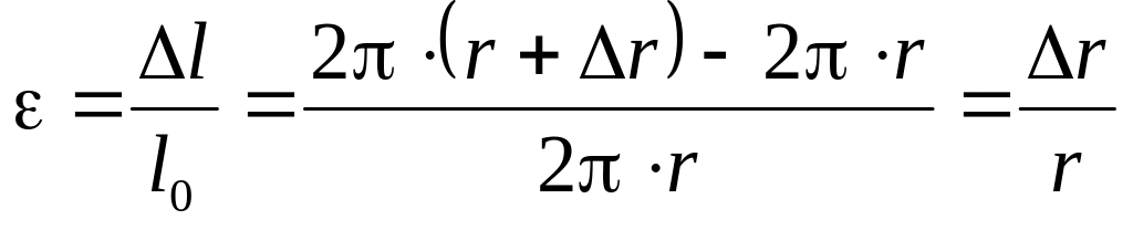 Определим теперь, на сколько удлинится радиус вращающегося кольца. Относительное удлинение волокон кольца равны: