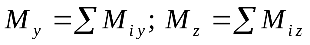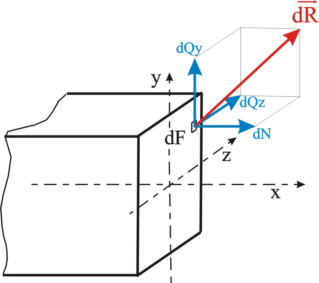 Приводят систему сил к одной точке (как правило, к центру тяжести сечения) и проецируют главный вектор и главный момент системы внутренних сил на нормаль к плоскости (ось х) и главные центральные оси сечения (у и z).