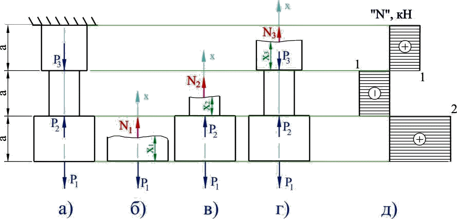 Пример 1: Пусть имеется ступенчатый стержень, нагруженный силами Р1 = 2 кН, Р2 = 3 кН и Р3 = 2 кН вдоль оси стержня, показанного на рис. 1.14, а. Определить величину продольных сил.