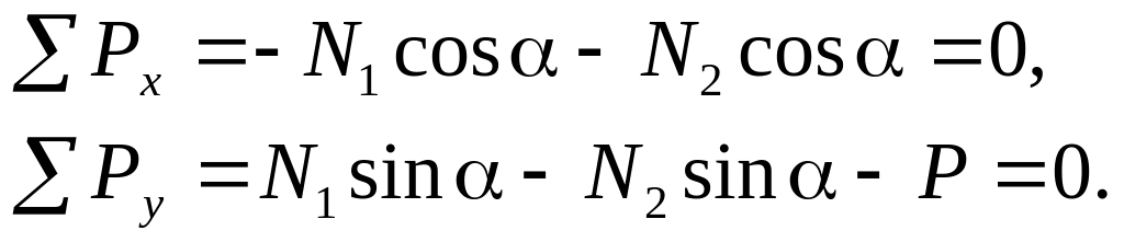 Пример 2: Два стержня, соединенные в т. А, находятся под действием силы Р (рис. 1.15,а). Определить усилия, действующие в стержнях.