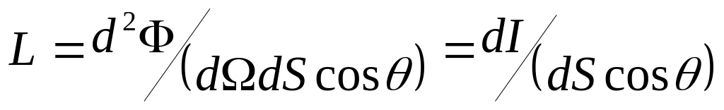 Яркость – L элемента поверхности dS под углом относительно нормали этого элемента есть отношение светового потока d2 к произведению телесного угла d, в котором он распространяется, площади dS и косинуса угла