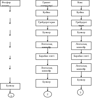 Фосфор шлактары, гранит еленділері және кокс ленталық конвейрмен бункерге салынып, одан салтақ дозаторымен воронкаға салынады. Ленталық жабдықтағыш шикізат материалдарын және коксты воронкаға салады. Ваграннадағы шаң бункерде жиналады. Вагранкаға қажетті ауа құбырлары және ауа үрлегіш арқылы жеткізіледі. Ауа қысымын реттеу үшін ауа реттегіш пайдаланылады. Балқыма бу соплосымен үрлейді. Байланыстырғыш бактан дозаларға жеткізіліп содан соң бу сопласына барады. Талшық түзу камерасында талшық шөгеді. Камерада вакуумда вентилятор түзейді. Камерадан мақта қабаты конвейрге түсіп конвейрлік кептіргішке брады. Ауа үрлегіш камерадағы ауаны құбыр арқылы сорып тұрады. Жылу агенті ретінде жану камерасынан алынатын түтін газдары пайдаланылады. Түтін газдарын реттеу үшін ол ауамен араластырып тұрады.