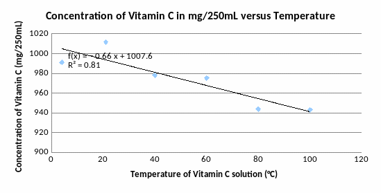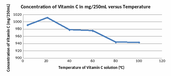 The aim of investigation was to find out the effect of temperature on concentration of Vitamin C (C6H8O6). The model of the temperature versus concentration Vitamin C in solution above displays a strong negative relationship, which meant that the concentration of Vitamin C declined over the temperature. The Vitamin C concentration started off being 1011.6 mg/250mL, and declined by 1,043 mg/250mL every 20 °C on average (see graph 2), until it reached 943.8 mg/250mL when temperature was 80°C. It proves my hypothesis that increasing of temperature will decrease the concentration of Vitamin C in solution, but as my data has only one point of temperature that lower than the room temperature as it is hard to prove or disprove second part of my hypothesis that decreasing of temperature will also decrease the concentration of Vitamin C in solution.