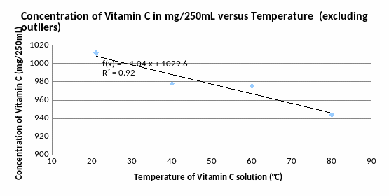 By observing the graph above, two outliers within the data can be identified: 4°C (too low concentration of Vitamin C for this temperature) and 100 °C (too high concentration of Vitamin C for this temperature). If you discount these outliers, a more believable model can be observed: