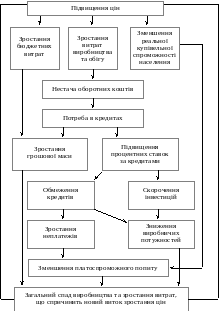 Позитивні зворотні зв’язки також можуть відігравати як сприятливу, так і несприятливу роль. Наприклад, зі зростанням інвестицій зростає ефективність виробництва, а це, своєю чергою, сприяє залученню нових інвестицій, які стимулюють подальше зростання виробництва, і т. д. (формула «капітал на капітал»). Як приклад небажаної, руйнівної дії позитивних зворотних зв’язків можна навести механізм розгортання гіперінфляційної спіралі, коли в нерівноважному стані економіки зростання цін через механізм причинно-наслідкових зв’язків спричиняє подальший виток зростання цін (рис. 2.3).
