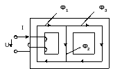 Ток, проходящий по катушке, создает магнитный поток Ф1, который, проходя по магнитопроводу, расходится на два потока Ф2 и Ф3 .