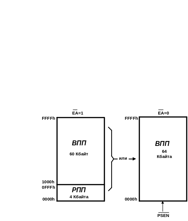 2. Когда сигнал имеет уровень логической единицы, а программный счетчик содержит число больше 0FFFh. Микроконтроллер, выбрав все команды из внутренней памяти программ, продолжает выполнять программу из внешней.