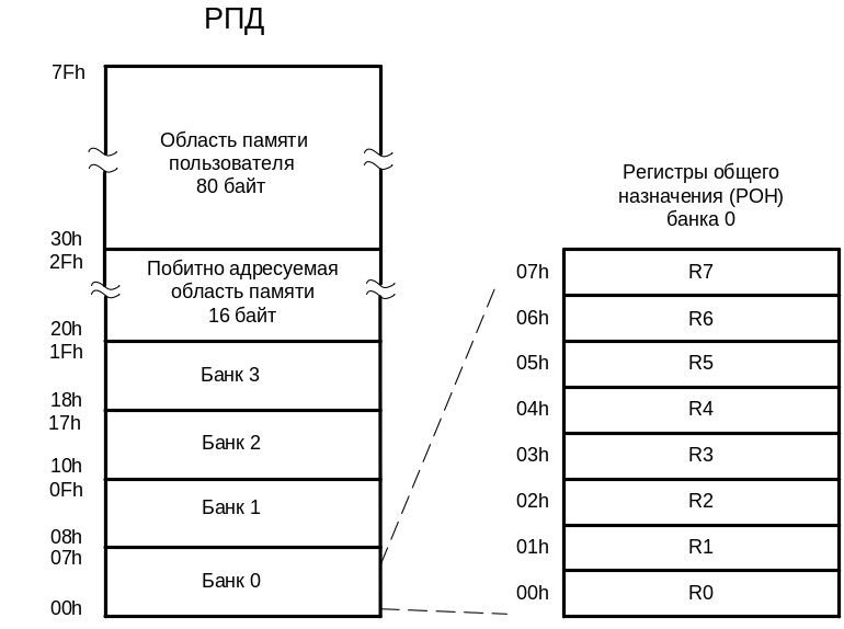 В нижней зоне РПД выделяют несколько специализированных областей. Первые 32 байта памяти с адреса 00h по 1Fh организованы в четыре банка регистров общего назначения, обозначаемых соответственно Банк 0 – Банк 3. Каждый банк состоит из восьми регистров R0-R7.