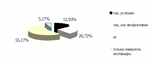 Дослідженням встановлено, що на підприємстві, де працюють респонденти, застосовуються тільки окремі складові системи мотивації праці, тому більшість працівників прагне її реформування. Крім того, спонтанні дії керівництва з мотивації праці персоналу приводять до зниження її ефективності. Так, 55,17 % працівників підприємства, які приймали учать в анкетуванні, вважають, що адміністрація не впроваджує будь-яких заходів щодо поліпшення системи мотивації, а 5,17 % впевнений, що своїми невивіреними діями тільки знижує рівень мотивації працівників (рис. 2).