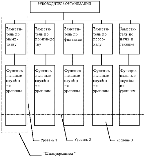 Основы линейных структур составляет так называемый "шахтный" принцип построения и специализация управленческого процесса по функциональным подсистемам организации (маркетинг, производство, исследования и разработки, финансы, персонал и т. д. ). По каждой подсистеме формируется иерархия служб ("шахта"), пронизывающая всю организацию сверху донизу (см. Рис. 1). Результаты работы каждой службы оцениваются показателями, характеризующими выполнение ими своих целей и задач. Соответственно строится и система мотивации и поощрения работников. При этом конечный результат (эффективность и качество работы организации в целом) становится как бы второстепенным, так как считается, что все службы в той или иной мере работают на его получение.