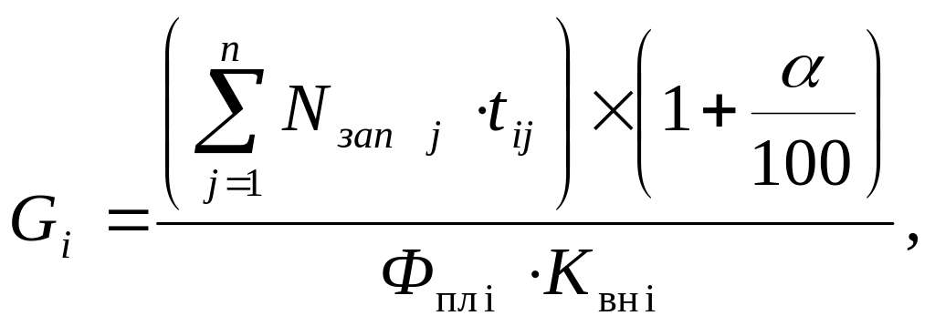 Кількість одиниць обладнання дільниці (або кількість робочих місць) на кожній i-й операції (Gi) визначається за кожним видом устаткування (або за групами однотипних верстатів) за формулою: